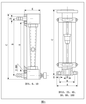 | LZB/LZB-( )F流量計的錐管為光滑內壁管(見圖4),通徑DN15以上的流量計,浮子通過導桿 上下移動,保持穩定;LZJ/LZJ-( )F流量計錐管 內壁有三條導向凸筋,使浮子保持穩定(見圖4)。通徑DN10以下的流量計采用軟管連接,配有 針形流量調節閥;通徑DN15以上流量計采用法蘭連接。