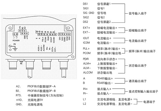④分體型電磁流量計勵磁電纜和轉換器之間的連接用專用接線完成,轉換器和外部的連接同一體型電磁流量計。