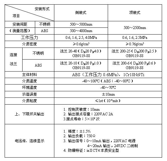 注: 1、側(cè)裝式采用不銹鋼材質(zhì)時(shí),測(cè)量范圍=安裝間距。采用ABS材質(zhì)時(shí),測(cè)量范圍=安裝間距L-150mm。 2、安裝間距(測(cè)量范圍)尺寸系列:500, 800, 1100, 1400, 1700, 2000, 2500, 3000, 3500, 4000, 4500, 5000 |
