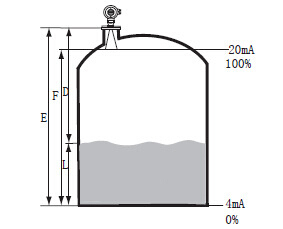 通過輸入空罐高度E(=零點),滿罐高度F(=滿量程)及一些應用參數來設定,應用參