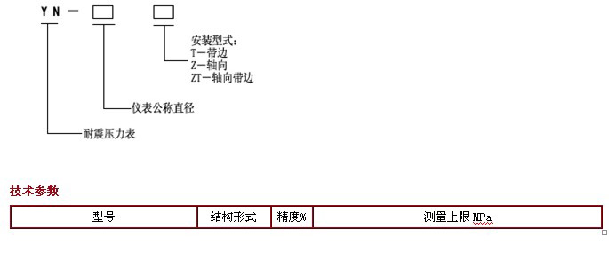 型號 | 結構形式 | 精度% | 測量上限MPa | YN-40/YN-40Z YN-50/YN-50Z/YN-50ZT YN-60/YN-60T/YN-60Z/YN-60ZT YN-75/YN-75ZT | 徑向 軸向帶邊 | 2.5 | 0-0.1; 0-0.16; 0-0.25; 0-0.4;0-0.6; 0-1; 0-1.6; 0-2.5; 0-4; 0-6; 0-10; 0-16;0-25; 0-40; 0-60;100;160;-0.1-0; -0.1-0.06; -0.1-0.15 ;-0.1-0.3;-0.1-0.5; -0.1-0.9; -0.1-1.5; -0.1-2.4 | YN-100/YN-100T/YN-100Z/YN-100ZT YN-150/YN-150Z/YN-150ZT | 徑向 軸向帶邊 | 1.6 | 0-0.06;0-0.1; 0-0.16; 0-0.25; 0-0.4;0-0.6; 0-1; 0-1.6; 0-2.5; 0-4; 0-6; 0-10; 0-16;0-25; 0-40; 0-60;100;160;250;-0.1-0; -0.1-0.06; -0.1-0.15 ;-0.1-0.3;-0.1-0.5; -0.1-0.9; -0.1-1.5; -0.1-2.4 |